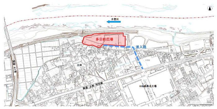 ・木曽川の自然とふれあえる場所であること、左岸堤防には散策利用があることを考慮し、計画地には木曽川左岸及びKルートと接続した休憩機能や便益機能、駐車場・駐輪場機能を整備する。