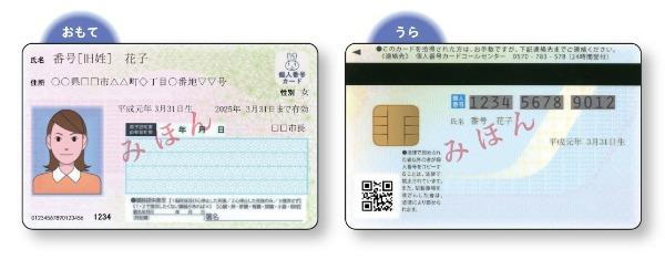 身分証明証にもなる顔写真付きのカードで、希望者に交付されます。おもて面に、顔写真、住所、氏名、生年月日、性別、追記欄(※)、うら面にマイナンバーが記載されます。