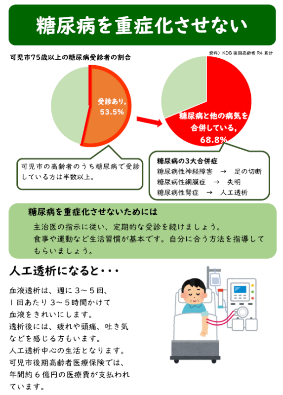 糖尿病の3大合併症は、糖尿病性神経障害、糖尿病性網膜症、糖尿病性腎症です。糖尿病性腎症は、悪化すると人工透析が必要になります。可児市の人工透析患者数は年々増加傾向です。