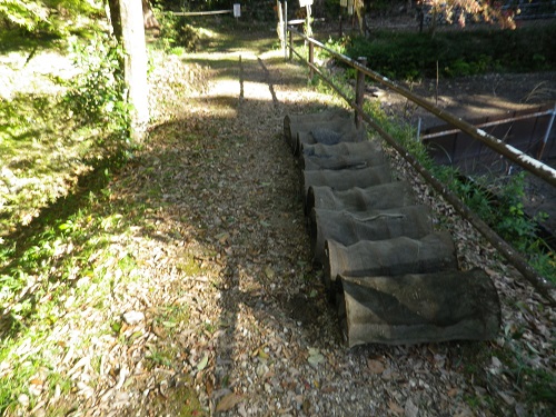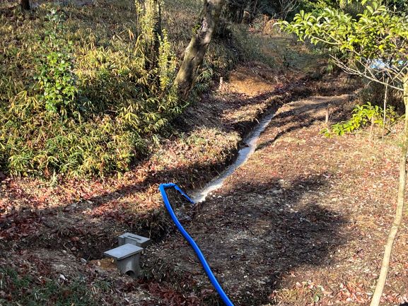 石灰窒素が下段の池に流用しないよう側溝工事をして、池の水を抜くことができました。