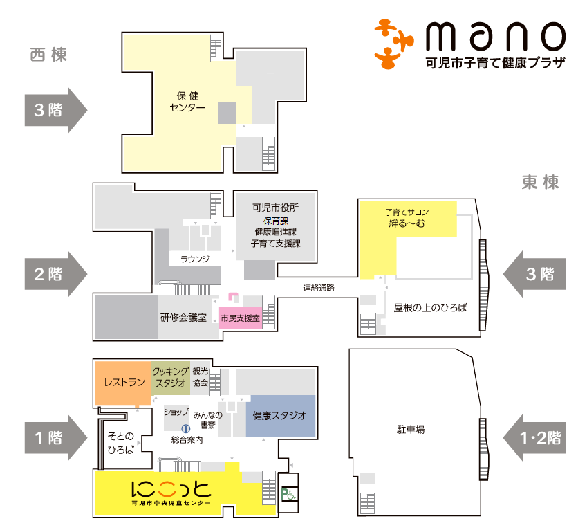 可児市子育て健康プラザ マーノは、可児市の子育て支援・健康づくりのための機能がぎゅっと凝縮した施設です。施設内には、可児市役所子育て支援課・保育課・健康増進課、保健センター、子育てサロン 絆る~む、中央児童センター にこっと などが整備されています。