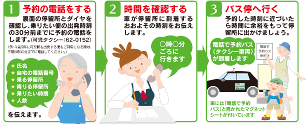乗降するバス停とダイヤを確認し、乗りたい便の起点出発時刻の30分前までに予約の電話をします。(予約の電話番号:0574-62-0152)