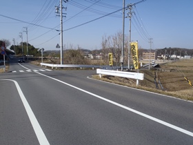 左の道をずっと進みますと、南北に走る県道多治見白川線に出ます。多治見白川線を南に「柿下」信号まで進み、信号を右折します。右折後は500メートルほど直進しますが、道路に歩車道の境界ブロックがなく、さらに車のスピードが出ていますので十分気をつけて進んでください。