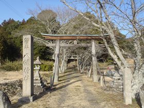 この道を400メートルほど南下し、土岐可児線の手前の細い道に入ります。細い道を70メートルほど進むと、久々利八幡神社が左に見えてきます。久々利八幡神社の創建年は不明ですが、各所の木材の組み方や彫刻などは、安土桃山時代の技法を踏襲しているなど、全体によく古色を残す市内最古級の木造建築物です。4月中旬に行われる大祭に用いられる台部や胴部が六角形の六角神輿は、明応2年(1493)に制作されたもので、県重要有形民俗文化財に指定されています。